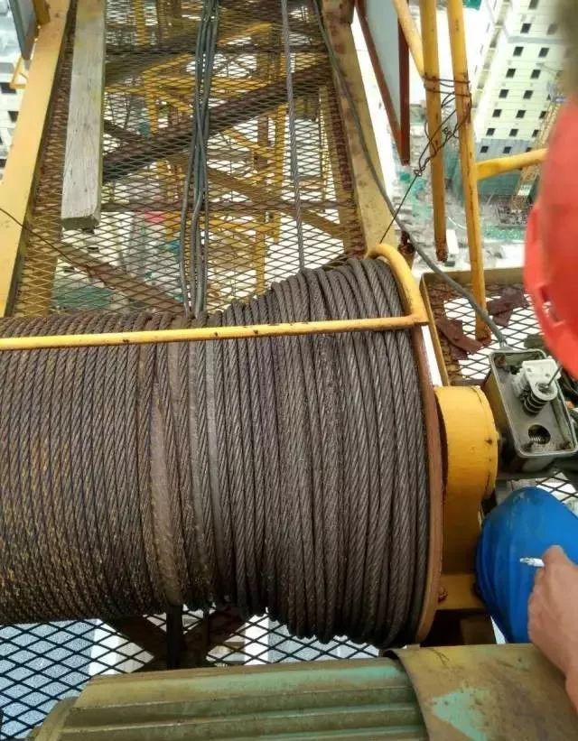 鋼絲繩的規格型號應符合塔機使用說明書的要求,潤滑良好,與金屬結構無摩擦。鋼絲繩不得有扭結、壓扁、彎折、斷股、籠狀畸變斷芯等變形現象,也不得磨損嚴重。(直徑不得減小7%,斷絲數不得大于總根數的10%。)