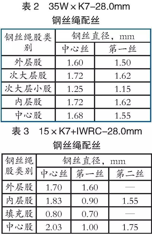 35W×K7和15×K7+ IWRC內(nèi)外層捻向相反,均屬阻旋轉(zhuǎn)鋼絲繩,以規(guī)格為φ28.0mm鋼絲繩為例,在相同表面狀態(tài)和強(qiáng)度級別情況下,兩者相關(guān)參數(shù)見表1。