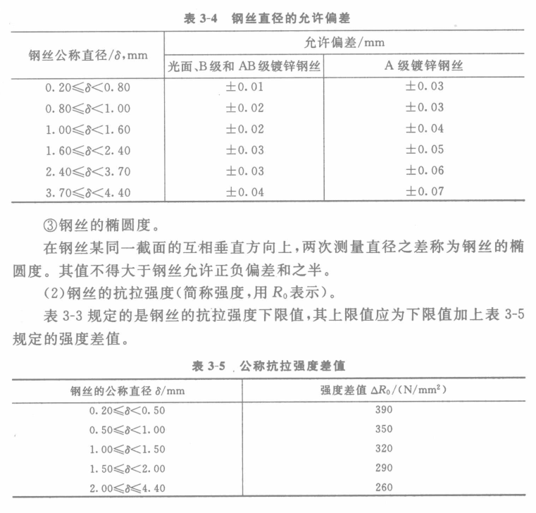 用精度為0.01mm的千分尺,在鋼絲的同一截面內(nèi)互相垂直的方向上兩次測量所得直徑的算術(shù)平均值,即為鋼絲的實際直徑。其允許偏差應(yīng)符合表3-4的規(guī)定。