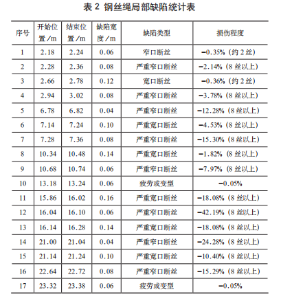 如對福抗藥業(yè)的一臺貨梯鋼絲繩利用EMT-C智能鋼絲繩探傷儀進(jìn)行無損檢測的結(jié)果(見圖1和表2)。