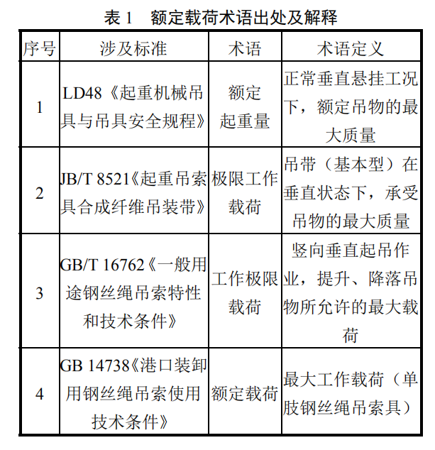兩倍額定載荷的拉力試驗是國家標準要求中的出廠檢驗項目,是任何生產制造廠強制要求執行的常規檢驗項目。吊索具進行該試驗后,應依然可以正常使用。額定載荷術語的定義多種多樣,如表1所示。