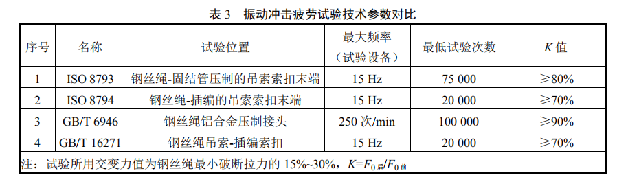 2.2.2振動沖擊疲勞試驗吊索具申請船級社型式認可,其中強制要求吊索具產品進行振動沖擊疲勞試驗。參考標準為GB/T16271和GB/T6946,試驗的宗旨在于評價吊索具產品在受到振動沖擊、周期性循環受力狀態下的疲勞性能,以此確保其在限定工況下的安全穩定性。其中難點在于,鋼絲繩吊索具的結構型式不同,在國內標準和國際標準中,其振動沖擊疲勞試驗技術參數有所區別,現對其進行對比,如表3所示。